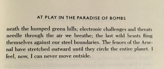 Now here’s the last two lines: “The fences of the Arsenal have stretched outward until they circle the entire planet. I feel, now, I can never move outside.”