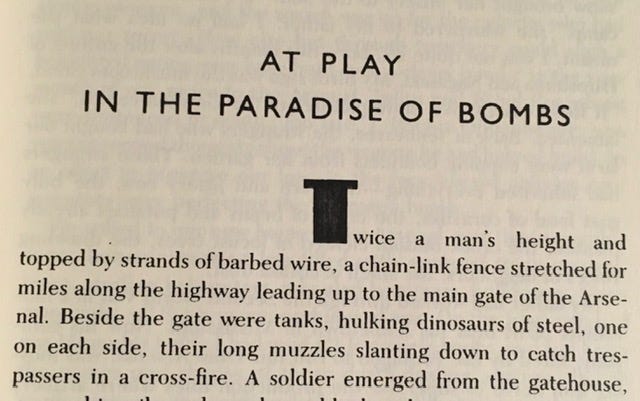 Sanders is a young boy when his family moves to the Arsenal, a bomb-making military facility in Ohio. The year is 1951, and the Arsenal is booming because of the Korean War. It’s a good move for his family, but Sanders, as a child, is scared of the fence. The fence becomes a symbol all throughout the essay—we see it again and again.