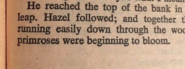 Last line: “Hazel followed; and together they slipped away, running easily down through the wood, where the first primroses were beginning to bloom.”
